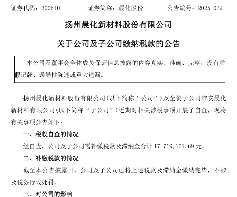 9月30日,晨化股份(300610)发布公告,公司及全资子公司淮安晨化新材料有限公司近期对子系涉税事项开展了自查,发现需补缴税款及滞纳金统统1772万元。