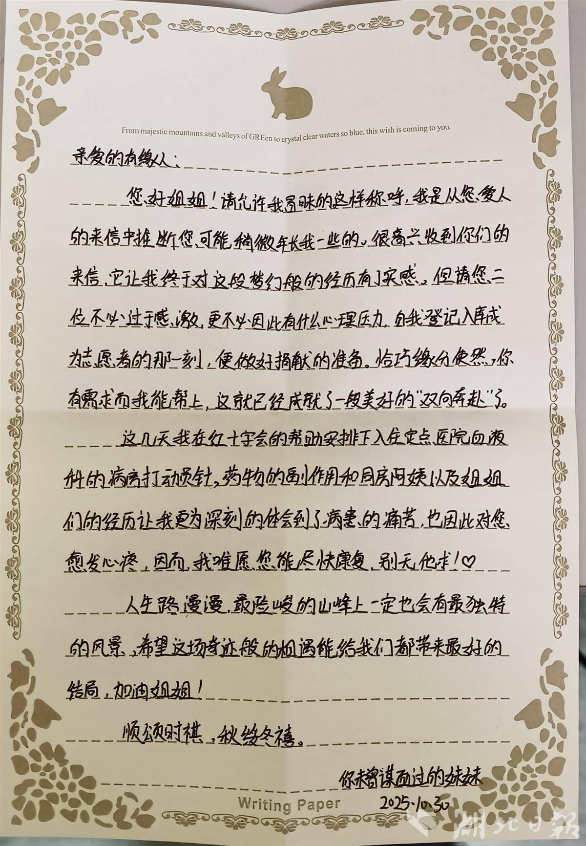 2014年秋,刚入大学的杨娇在献血活动中登记加入中华骨髓库。历经十一年、屡次有关表情变更,她长久未改捐献初心。2025年,当湖北分库责任主谈主员波折有关她,陈说与又名患者初配胜仗时,她绝不夷犹:“十一年的恭候,即是为了这一天。”