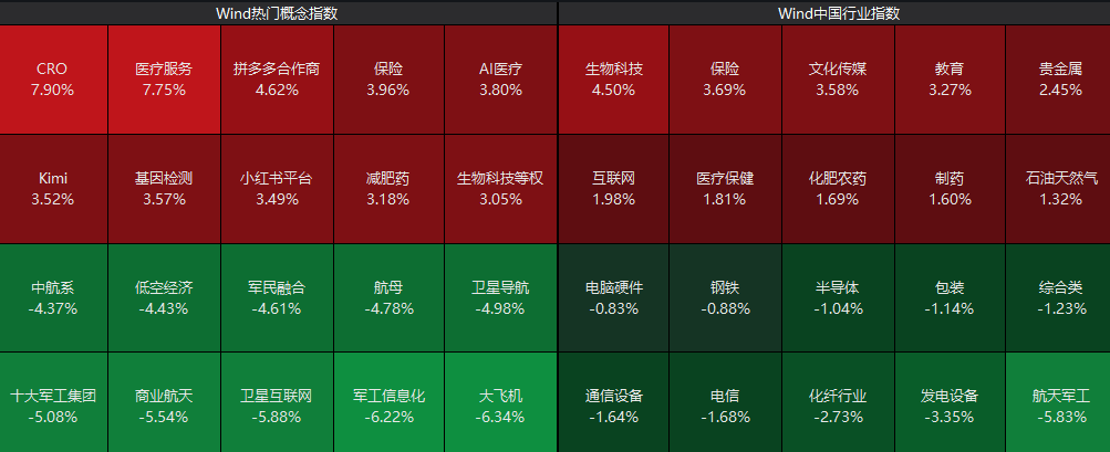 从板块来看,AI利用宗旨持续强势,AI医疗、文化传媒、电商等宗旨领涨;生意航天板块快速下落,发电开导、军工、半导体等板块走低。