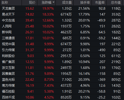 此外开yun体育网,文化传媒、AIGC等宗旨走高,天龙集团杀青20%涨停,东说念主民网、新华网、视觉中国、引力传媒等多股涨停。