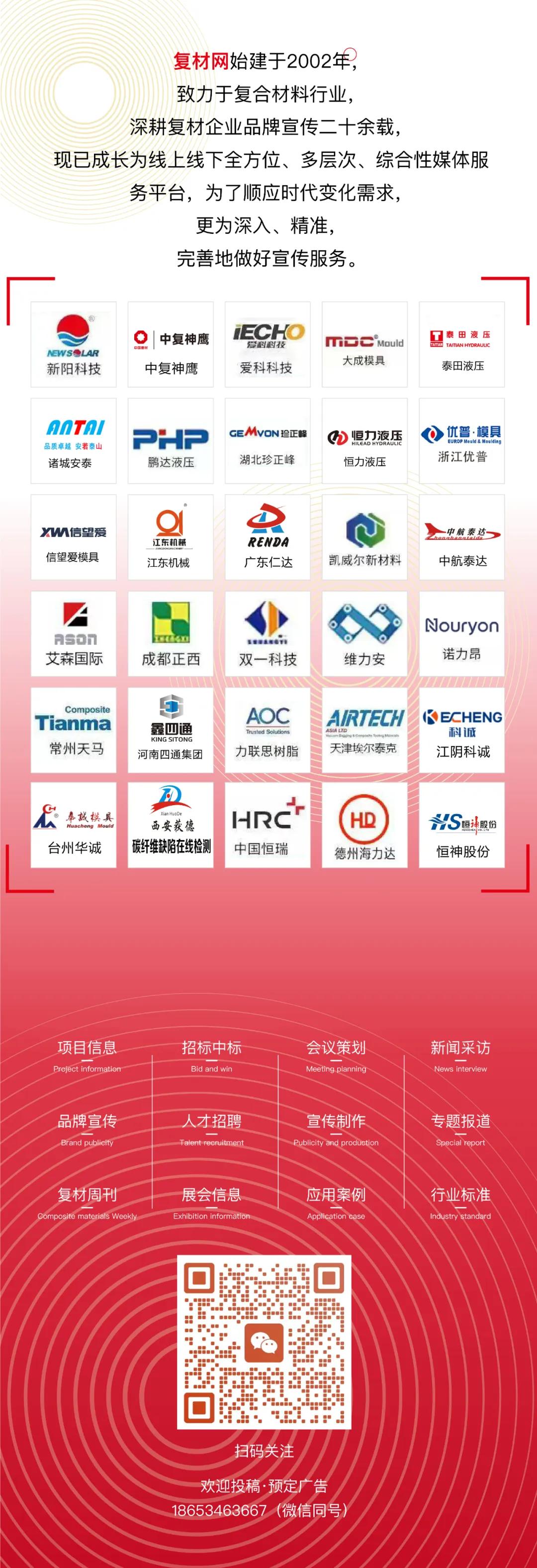 复材网始建于2002年,戮力于复合材料行业,深耕复材企业品牌宣传二十余载。现已成长为线上线下全方向、多端倪、详细性媒体职业平台,为了适当时间变化需求,更为长远,精确,完善地作念好宣传职业。讨论电话:400 9692 921;互助信箱:frp@cnfrp.com