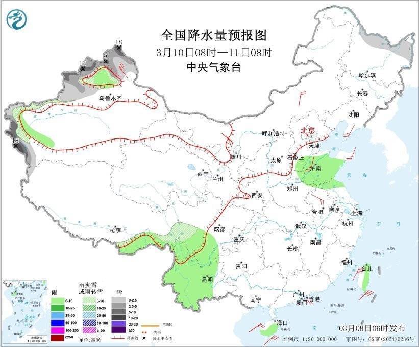 r3月10日08时至11日08时,新疆北疆北部和南疆西部山区、黑龙江北部、川西高原南部等地部分地区有小到中雪或雨夹雪,其中,新疆北疆北部和南疆西部山区等地部分地区有大雪,局地暴雪(10~18毫米)。新疆北部盆地、西藏东南部、四川南部、云南大部、山东大部、江苏北部、海南岛中南部、台湾岛东部等地部分地区有小雨。新疆北部、内蒙古中西部、辽东半岛、山东半岛、安徽北部等地部分地区有4~6级风;台湾海峡、巴士海峡、南海中北部海域、北部湾将有6~7级风、阵风8级(见图3)。