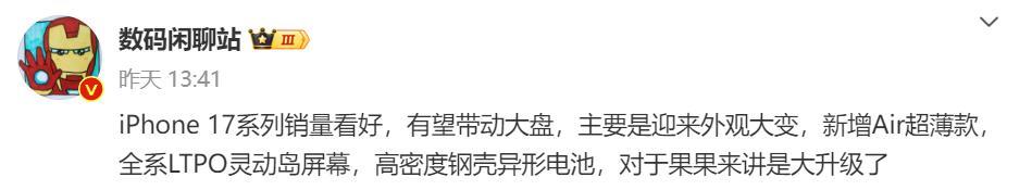 据博主@数码闲聊站 发文清晰,其看好苹果 iPhone 17 系列手机销量,且系列手机全系标配 LTPO 灵动岛屏幕、高密度钢壳异形电板。