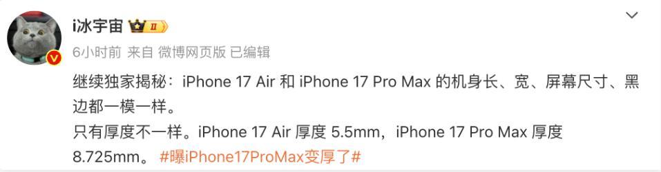 该博主的音书还炫耀,iPhone 17 Air 和 iPhone 17 Pro Max 的机身长、宽、屏幕尺寸、黑边齐一模相似。惟一厚度不相似:iPhone 17 Air 厚度 5.5mm,iPhone 17 Pro Max 厚度8.725mm。