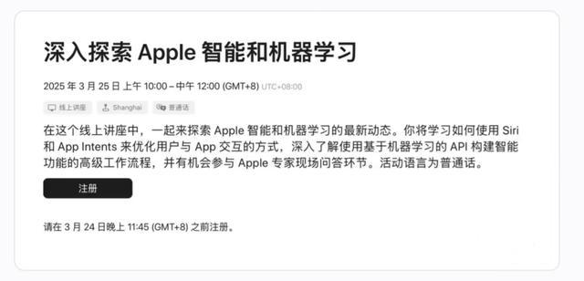 苹果公司向确立者发送邮件,清晰苹果将于北京技艺3月25日 10:00-12:00 在上海举行“哄骗 Apple 智能的力量”确立者行动,暗意国内Apple 智能(Apple Intelligence )AI 功能行将上线。